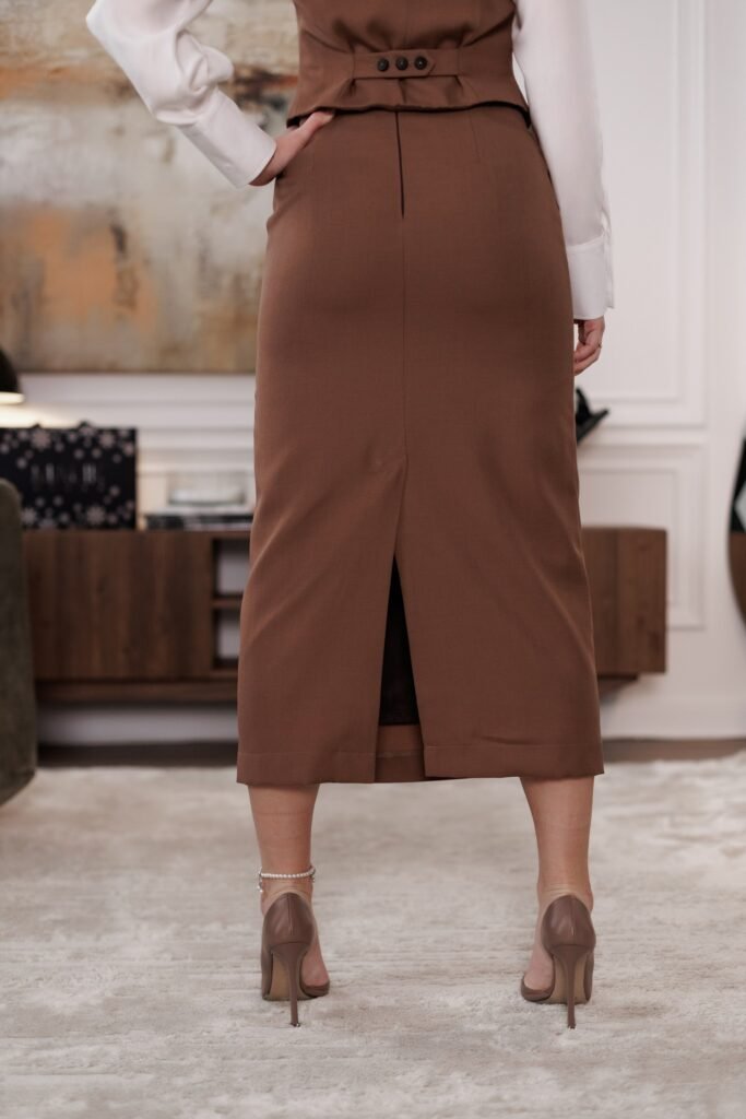 Вы будете чувствовать себя уверенно и на деловой встрече, и на вечернем ужине. Юбка гармонично смотрится как с жилетом, так и с пиджаком, превращаясь в универсальную деталь гардероба.