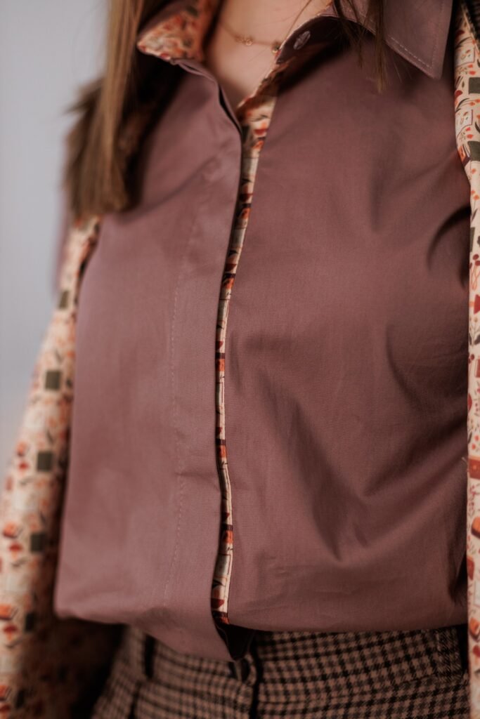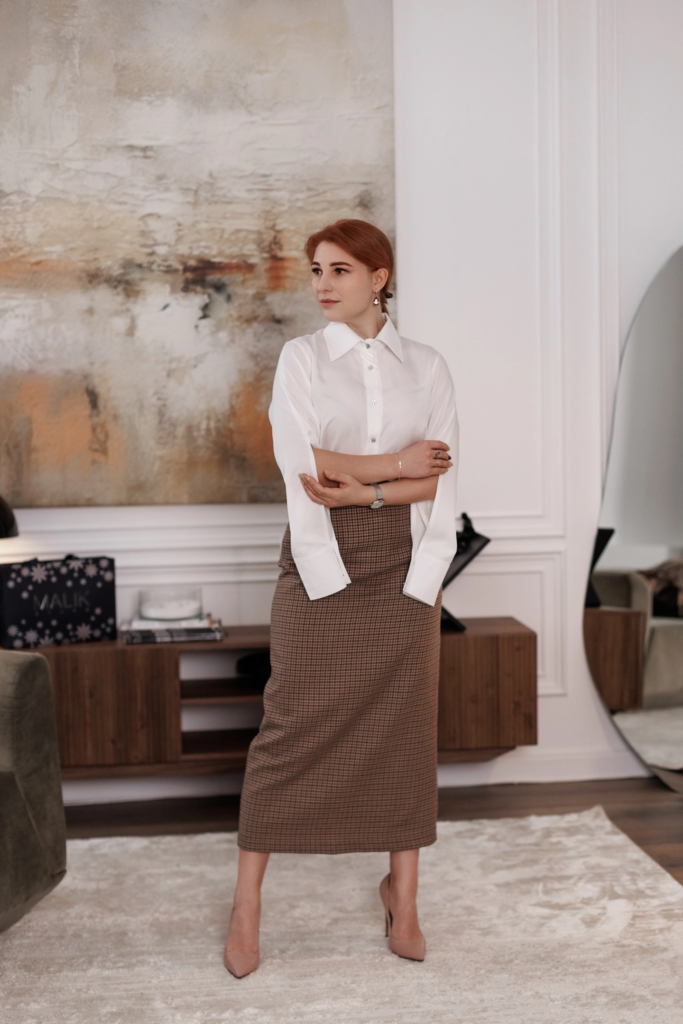 Она выглядит деликатно и женственно, особенно в сочетании с жилетом или пиджаком. Рукава с манжетой, мягкий воротник с «начинкой», скрытая застежка с интересной полочкой придают образу расслабленную элегантность, которая уместна в любом контексте — от работы до похода на свидание.