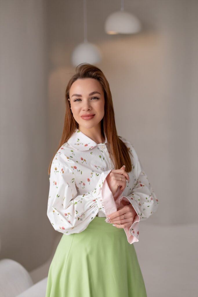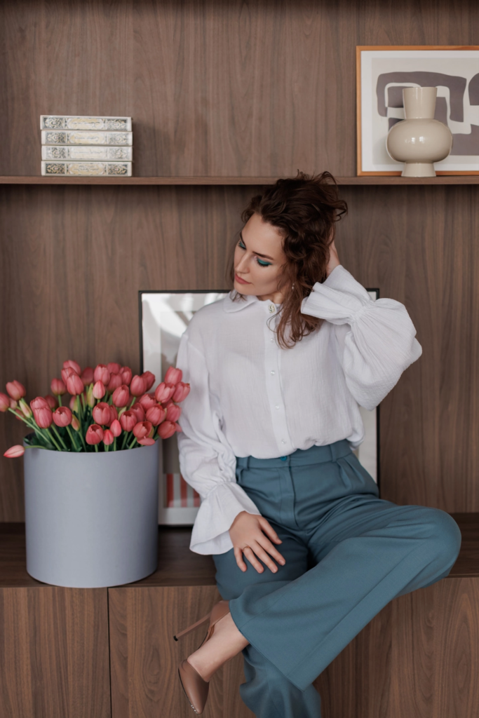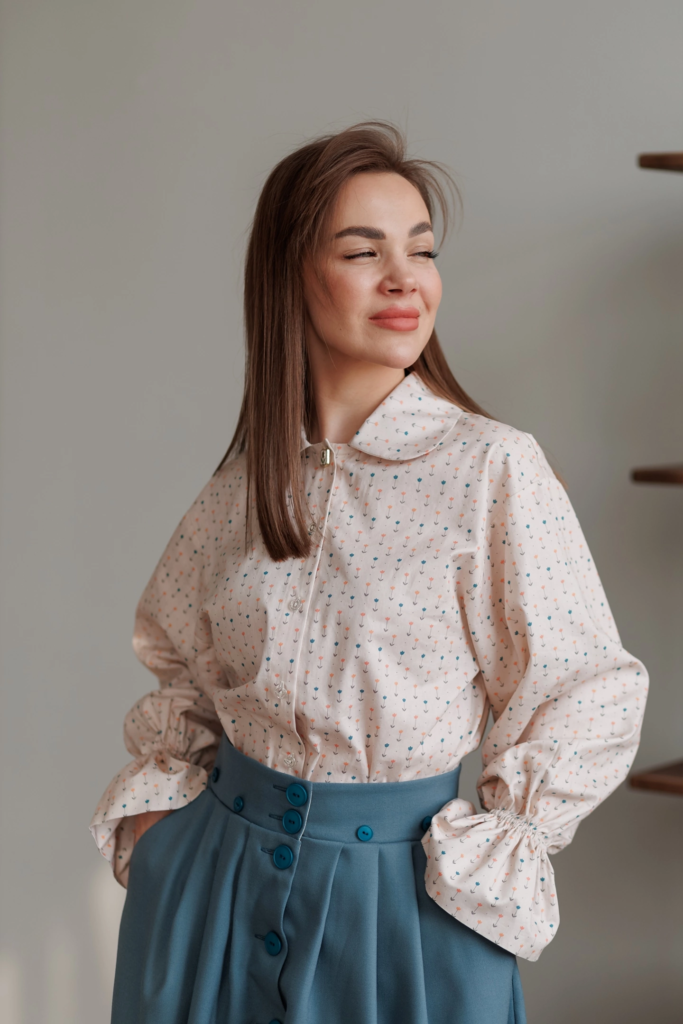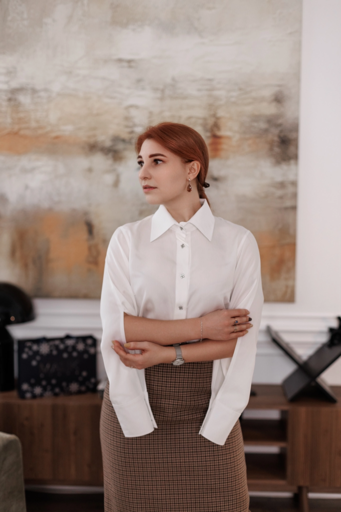 Оттенок сливочного молока делает рубашку универсальной: она легко сочетается как с классическими костюмами, так и с повседневными брюками или юбками, создавая разные настроения — от делового до романтичного.